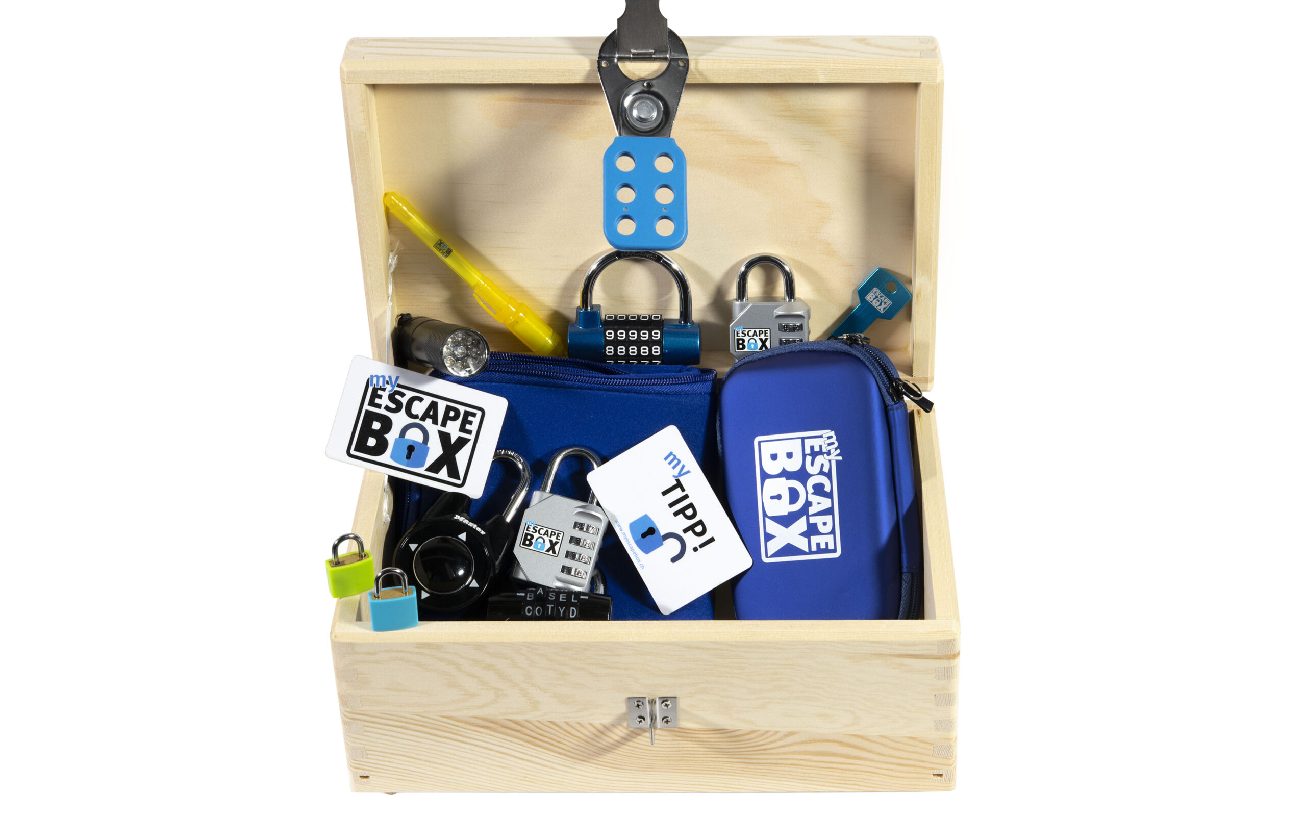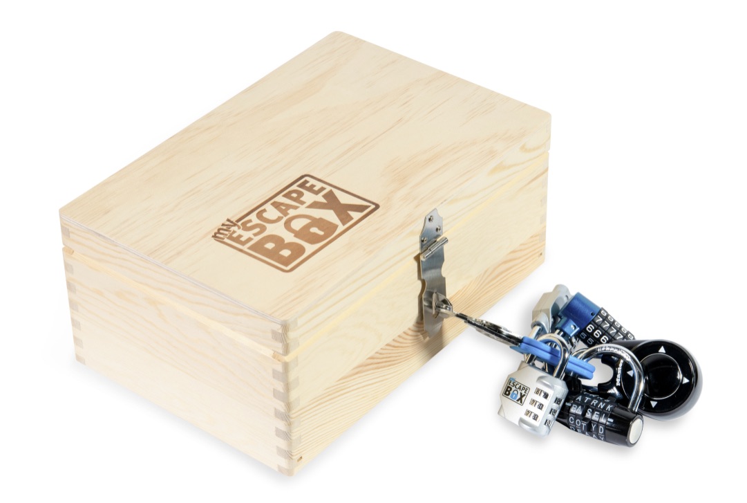 In der sorgfältig aus Holz hergestellten EscapeBox mit angenehm abgerundeten Ecken und ‚Füsschen‘ befindet sich ein grosses Basis-Set an Schlössern und Materialien, die du für deine Escape-Spiele brauchst: