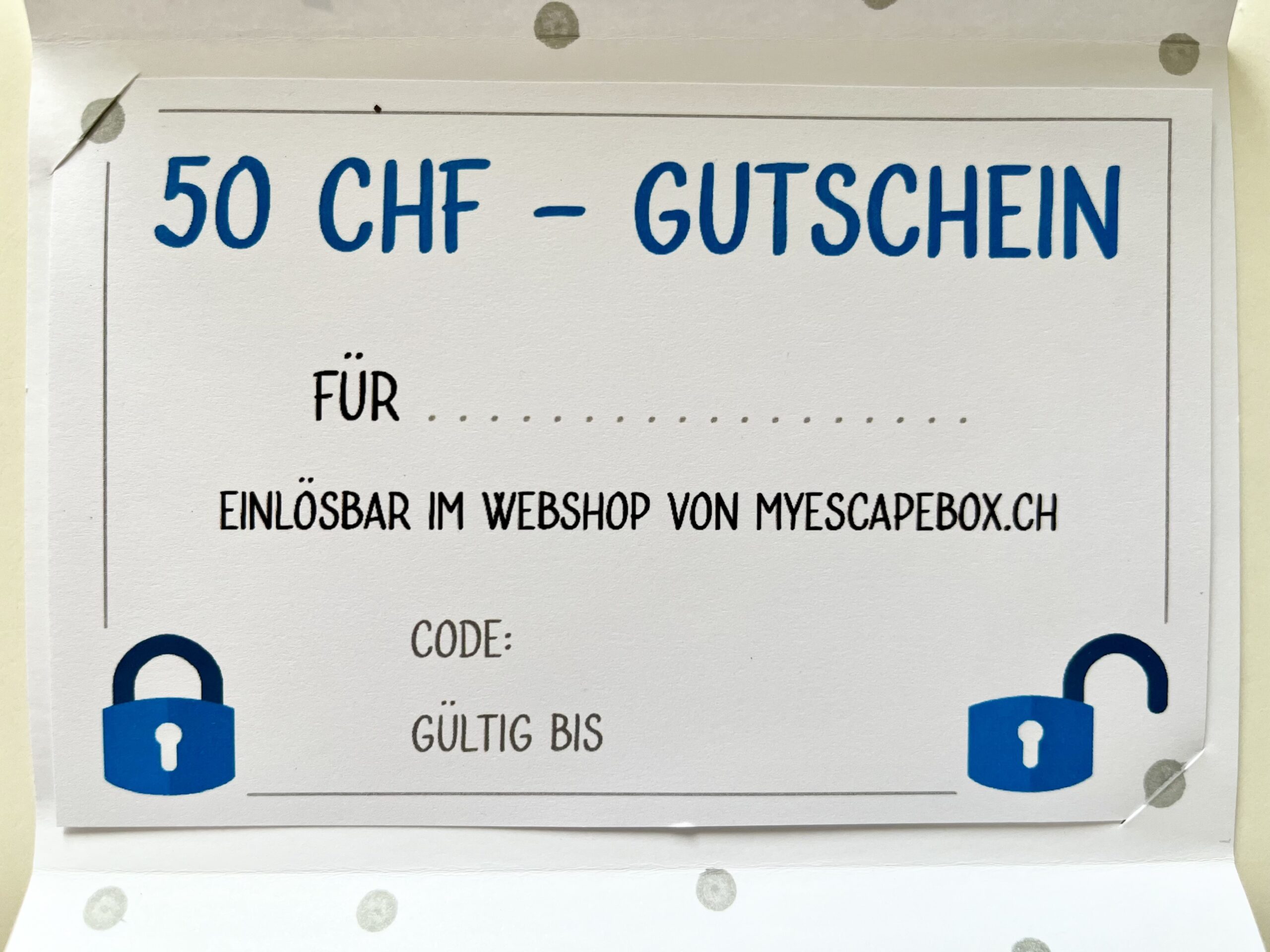 Mit diesem 50 CHF-Gutschein bereitest du jemandem eine grosse Freude! Der/Die Beschenkte kann ihn auf sämtliche Artikel in unserem Webshop anwenden.