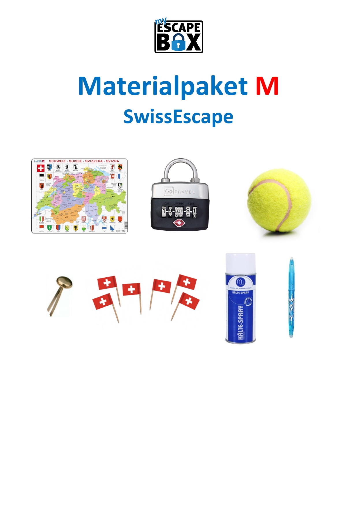 Dieses Materialpaket enthält Gegenstände, die dein SwissEscape-Spiel ‚haptischer‘ und erlebnisreicher machen: